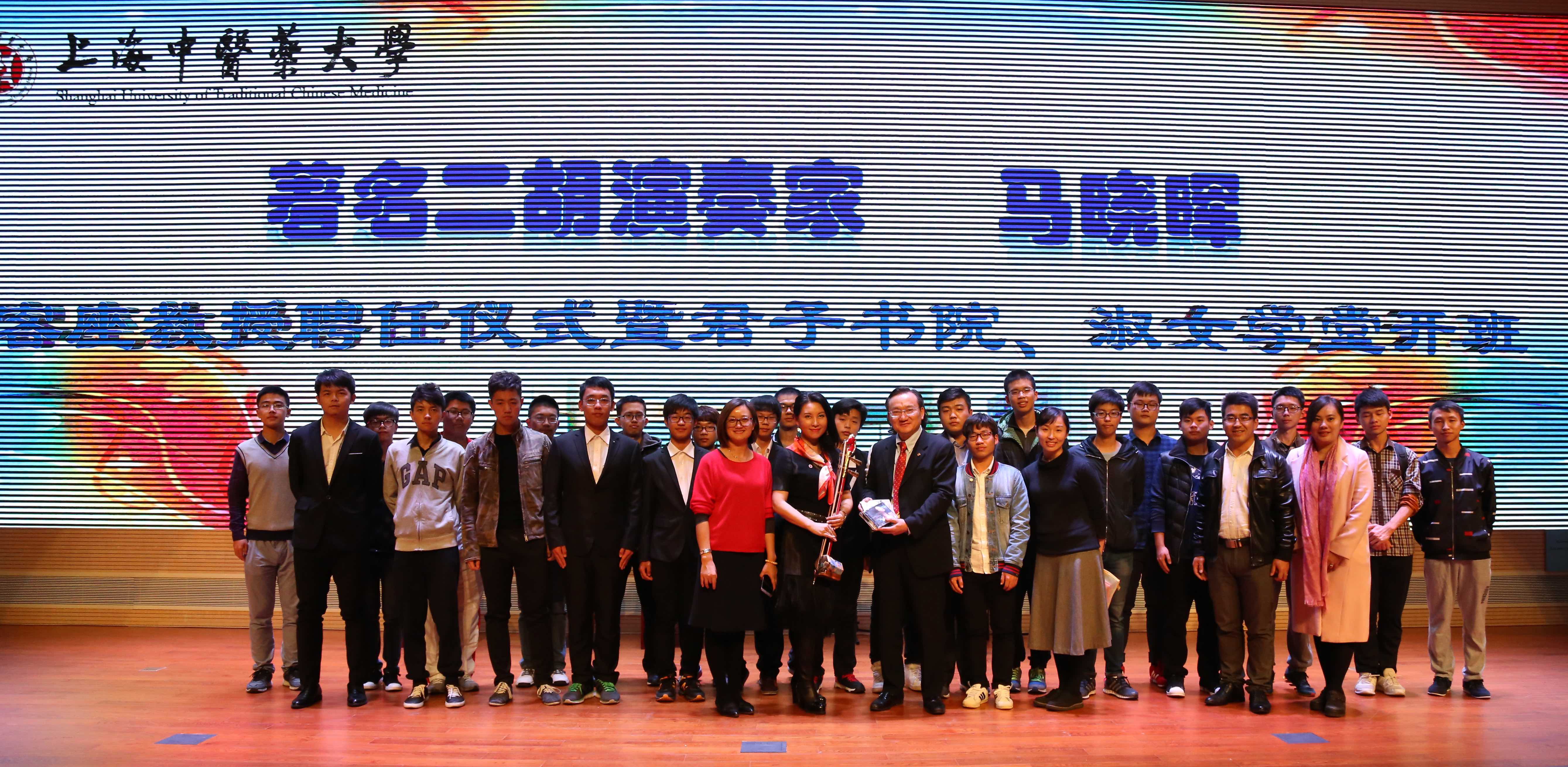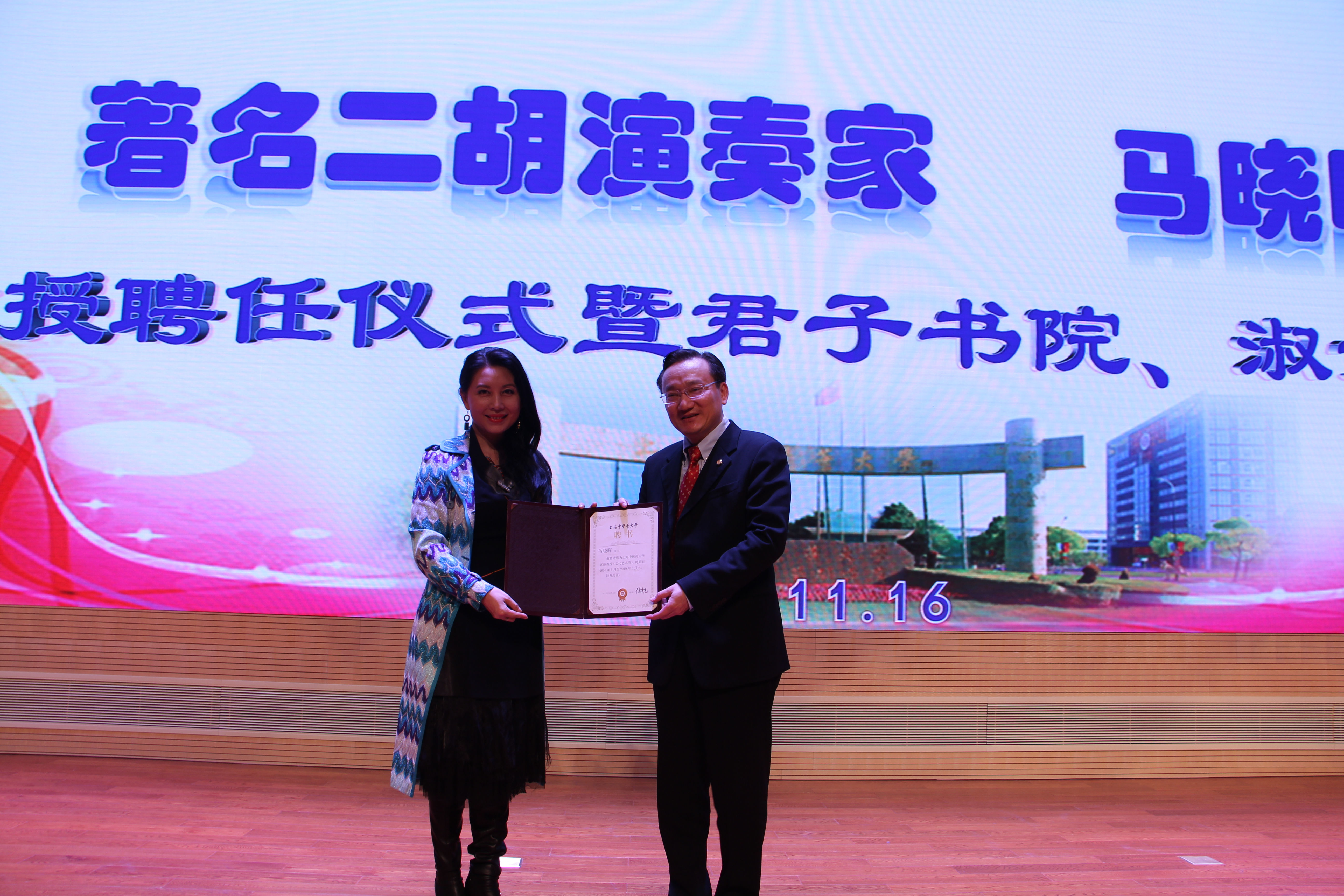 11月16日下午,著名二胡演奏家马晓晖客座教授聘任仪式暨“君子书院” “淑女学堂”开班仪式在图书馆四楼报告厅举行。我校校长徐建光,校党委副书记、纪委书记施建蓉,校党委副书记、副校长朱惠蓉,上海社会科学院智库建设基金会理事长杨亚琴、哲学研究所副所长黄凯锋,上海东亚联合控股集团董事长徐闯,上海天域时捷信息系统有限公司董事长金升俊,青年企业家代表宣浩,上海民族乐器厂厂长王国振,以及我校职能部门、二级学院领导和400余名同学参加仪式。仪式由朱惠蓉主持。