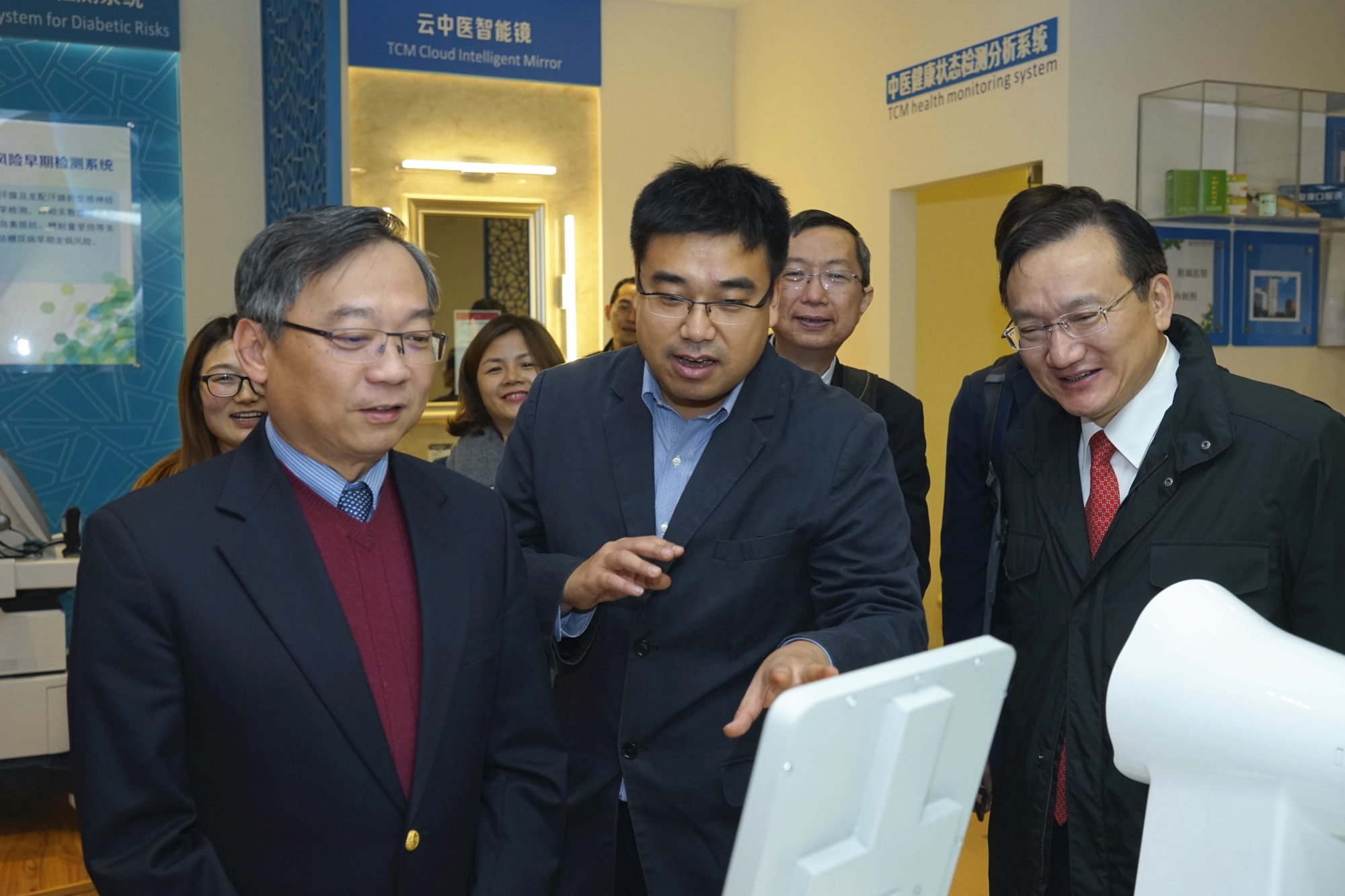 应新方的要求,我校校长徐建光陪同颜金勇一行首先前往设立于我校的上海中医健康服务协同创新中心,了解基于大数据理论的智慧中医项目和慢性病管理项目,并请颜金勇体验了云中医智能镜等我校自主研发产品。