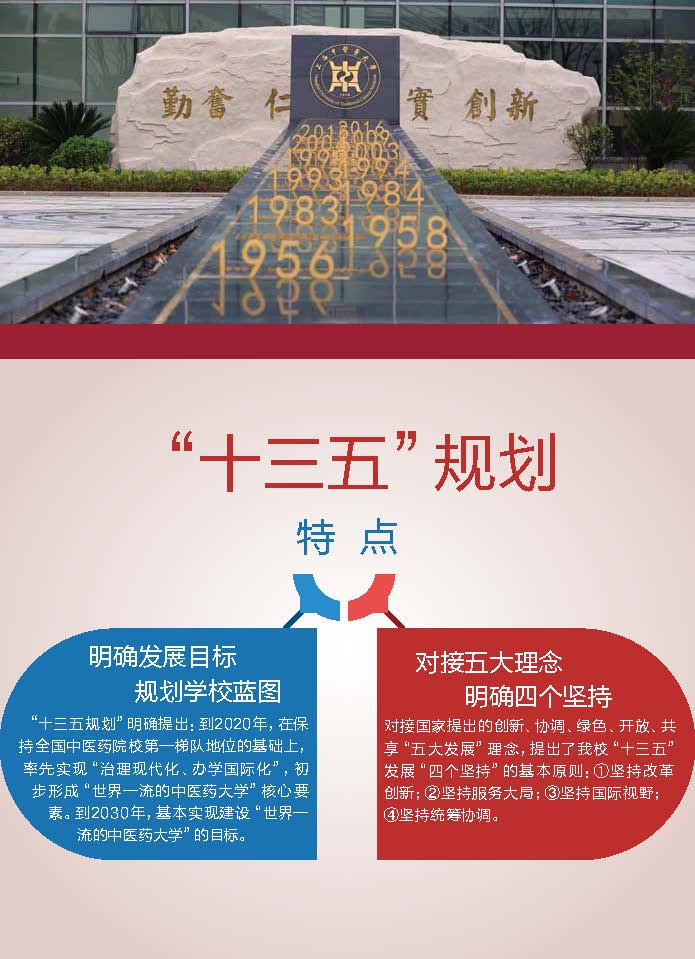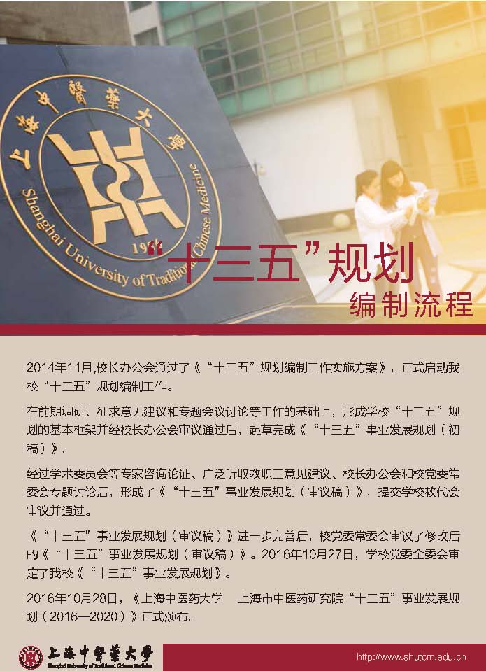 《上海中医药大学 上海市中医药研究院“十三五”事业发展规划(2016—2020)》(下称“‘十三五’规划”)于10月28日正式发文公布。学校的“十三五”规划指明了学校未来的改革发展方向、明确了发展目标、规划了学校蓝图。为了让广大师生能更好地了解学校“十三五”规划,日前,学校发布了“十三五”规划图解版。
