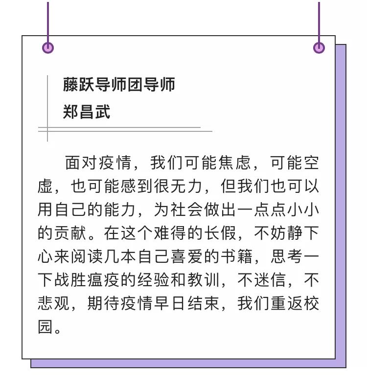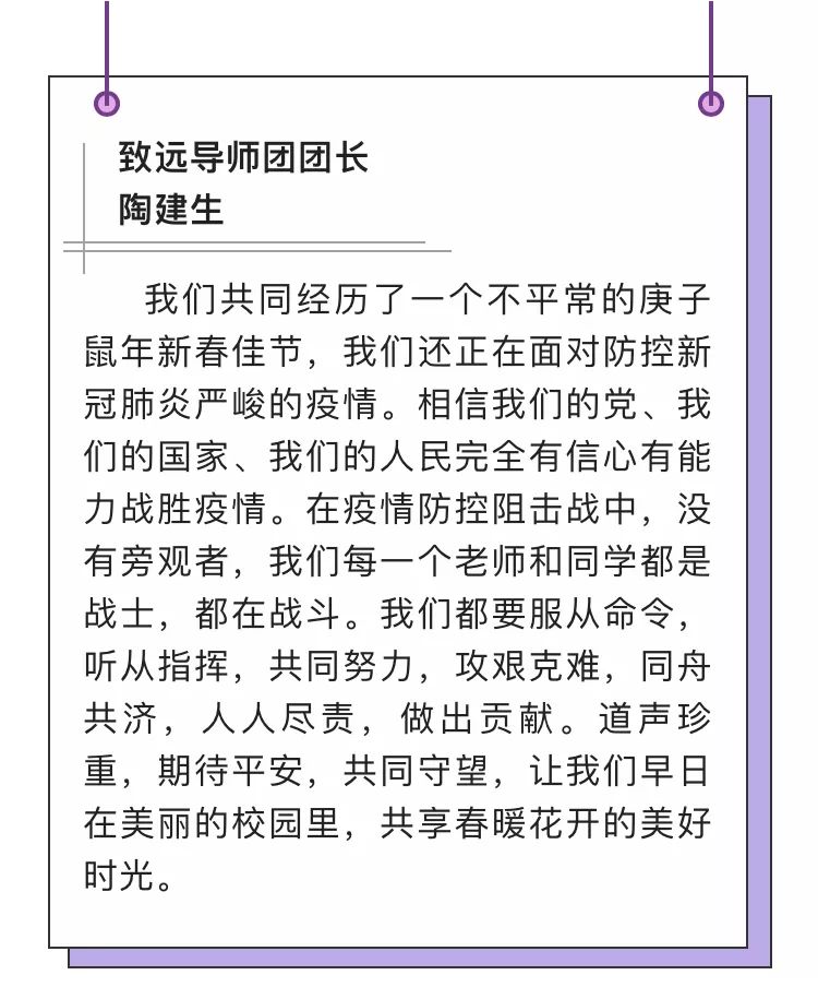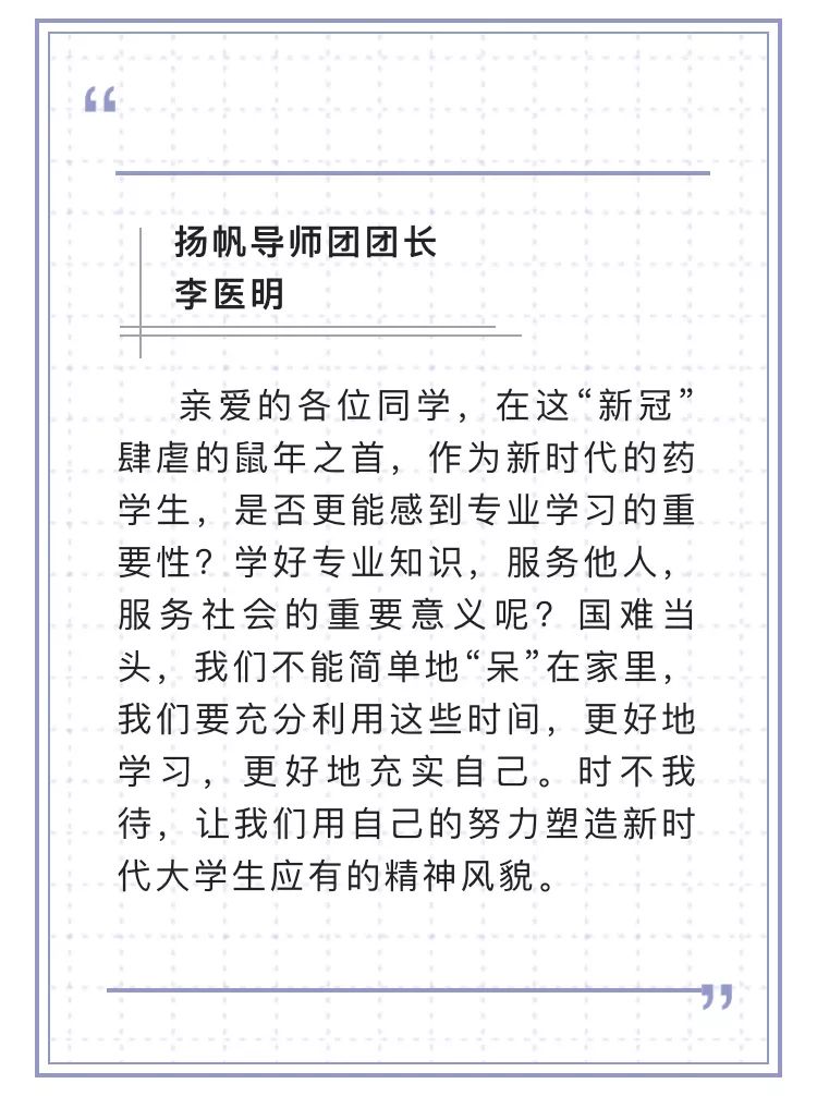 面对这场突如其来的战“疫”,大学生们没有足够的思想和心理准备,调整心态、积极应对才是学生工作队伍要解决的根本问题。导师团的导师们再一次发挥了强大的人格魅力和卓越的影响力,他们将自己的智慧、经验、思考和感悟通过一段段文字,汇聚成一股强大的力量,鼓舞激励杏林学子练就过硬本领、助力健康中国。如致远导师团团长陶建生教授提到:“相信我们的党、我们的国家、我们的人民完全有信心有能力战胜疫情。在疫情防控阻击战中,没有旁观者,我们每一个老师和同学都是战士、都在战斗。”扬帆导师团团长李医明教授提到:“作为新时代的药学生,是否更能感到专业学习的重要性,学好专业知识、服务他人、服务社会的重要意义。”最让人感动的是作为蒲公英导师团团长的林国强院士,不顾70高龄和工作繁忙,主动要求为大学生寄语,并亲自为学生写就一份情真意切的告学子书,信中提到:“武汉疫情,牵动人心之余,却让人愈发坚信;阴霾之下,大爱始终熠熠生辉。在不久的将来,你们将是中流砥柱,守护生命、健康中国的重任将落在你们的身上。”院士和导师们的殷切嘱托给大学生注入强大的动力。他们从身边的榜样身上感受到使命和责任、智慧和力量。