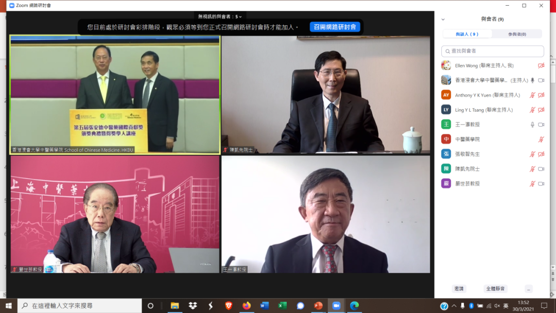 3月30日下午,第五届张安德中医药国际贡献奖颁奖典礼在线上举行。香港浸会大学校长卫炳江教授、评委会主席陈凯先院士、香港浸会大学中医药学院院长吕爱平教授、张安德慈善基金董事张敬智先生,以及逾300名香港注册中医师参加线上典礼。陈凯先院士介绍了获奖人情况,我校终身教授严世芸喜获殊荣,以表彰严世芸教授在推动中医药国际化和中医药科学研究方面的贡献和成果。此前,上海市中医药学会会长胡鸿毅教授对该奖项进行提名推荐。