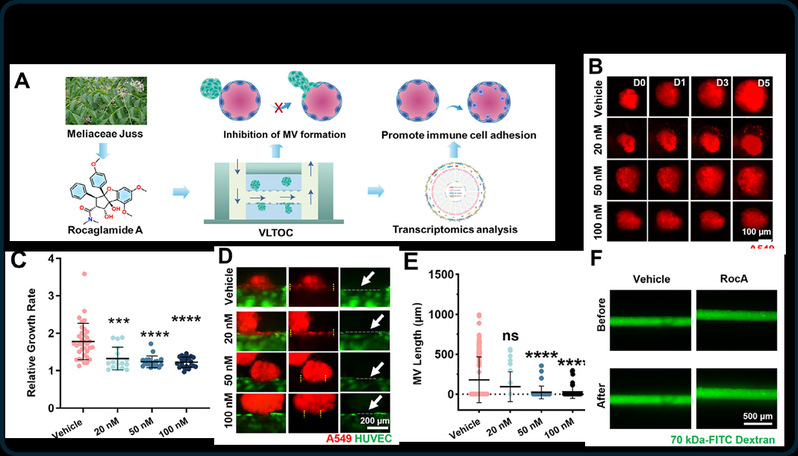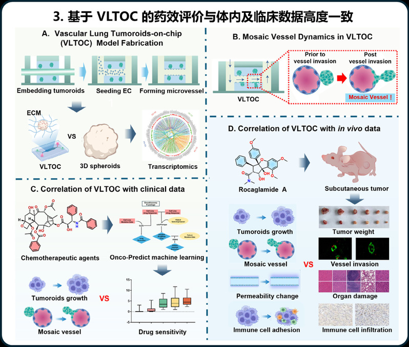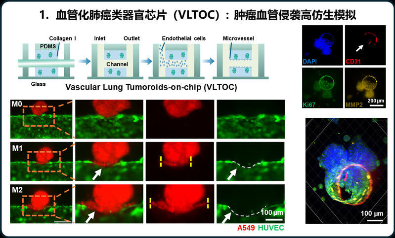 非小细胞肺癌(NSCLC)患者的5年生存率仅为5%,而肿瘤转移是导致患者死亡的主要原因。血管是NSCLC转移的主要通道,阻断肿瘤细胞通过血管系统实现转移是抑制NSCLC转移的重要策略。然而,目前常用的肺癌体外模型普遍缺乏具备高仿生特性的血管结构,难以真实模拟肿瘤与血管之间的相互作用,也无法动态再现肿瘤转移的关键过程,这严重制约了抗转移药物疗效的精准评估。针对上述瓶颈,我校交叉科学研究院葛广波、郭兆彬团队借助微流控芯片等前沿技术,构建了一种新型血管-肺癌类器官芯片(Vascularized Lung Tomoroid-on-Chip, VLTOC),其可高仿生模拟肿瘤-血管嵌合体的形成、EPR效应等肿瘤转移关键事件。进一步借助荧光成像、超高分辨成像等技术对上述关键事件进行单细胞分辨率的原位实时追踪。组学分析显示VLTOC中肿瘤细胞增殖、代谢、侵袭及血管生成相关通路显著上调,较传统3D肿瘤球更贴近恶性进展表型,并揭示了细胞骨架动态重塑是驱动肺癌血管嵌合体形成的关键因素。