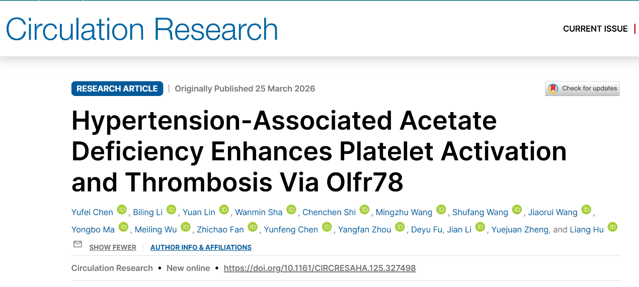 近日,心血管领域国际权威期刊、美国心脏协会(AHA)旗舰期刊Circulation Research在线发表了中西医结合学院胡亮研究员团队的最新研究成果:《Hypertension-Associated Acetate Deficiency Enhances Platelet Activation and Thrombosis via Olfr78》。该研究首次阐明了高血压血瘀证发生发展的微观分子机制,为 “五谷为养” 的经典养生与防治理论提供了科学证据。