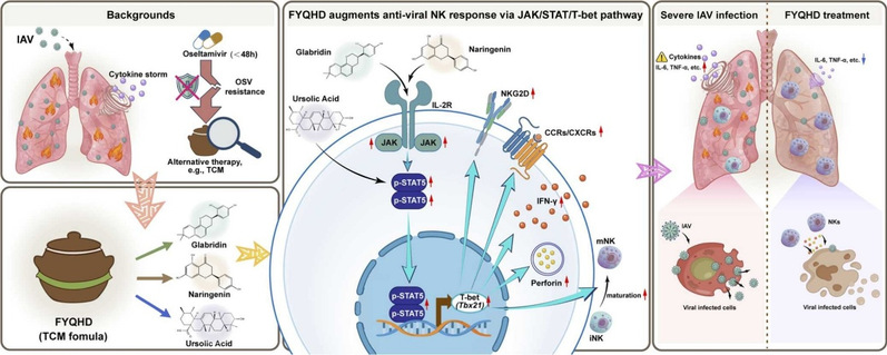 FYQHD能显著减轻流感病毒小鼠适应株A/Puerto Rico/8/34/H1N1(PR8)感染小鼠的肺组织病理损伤,维持肺泡正常结构,有效降低肺脏病毒载量和病毒滴度。NK细胞体内清除实验提示NK细胞是FYQHD发挥抗流感作用的关键效应细胞。深入研究发现FYQHD通过上调NK细胞表面趋化因子受体CCR2/3/6表达,增强NK细胞向感染肺脏趋化迁移的能力,从而显著增加肺脏NK细胞比例。同时,FYQHD促进肺脏NK细胞中转录因子T-bet和EOMES表达,推动NK细胞由CD11b⁻CD27⁻前体阶段向CD11b⁺CD27⁻成熟阶段分化、上调激活性受体NKG2D表达、增强γ干扰素和穿孔素分泌,高效杀伤病毒感染细胞。FYQHD及含药血清的三个关键活性单体——光甘草定、柚皮素和熊果酸,能活化IL-2R/STAT5的信号通路,发挥上调T-bet、EOMES等作用。研究不仅解析了临床治疗肺炎的常用方剂FYQHD通过调控NK细胞治疗流感的物质基础及科学机理,也阐明了靶向调控JAK/STAT/T-bet信号轴以增强NK细胞功能可能成为抗流感免疫治疗的有效策略。