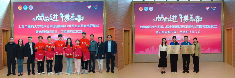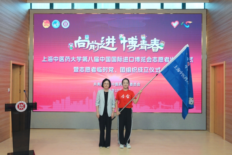10月22日,我校第八届中国国际进口博览会志愿者出征仪式暨志愿者临时党、团组织成立仪式在上海中医药大学全球伙伴交流中心举行。校党委副书记、副校长孟煜,相关职能部门、学院、研究院(所)负责人,以及77名第八届进博会志愿者和往届志愿者代表出席仪式。