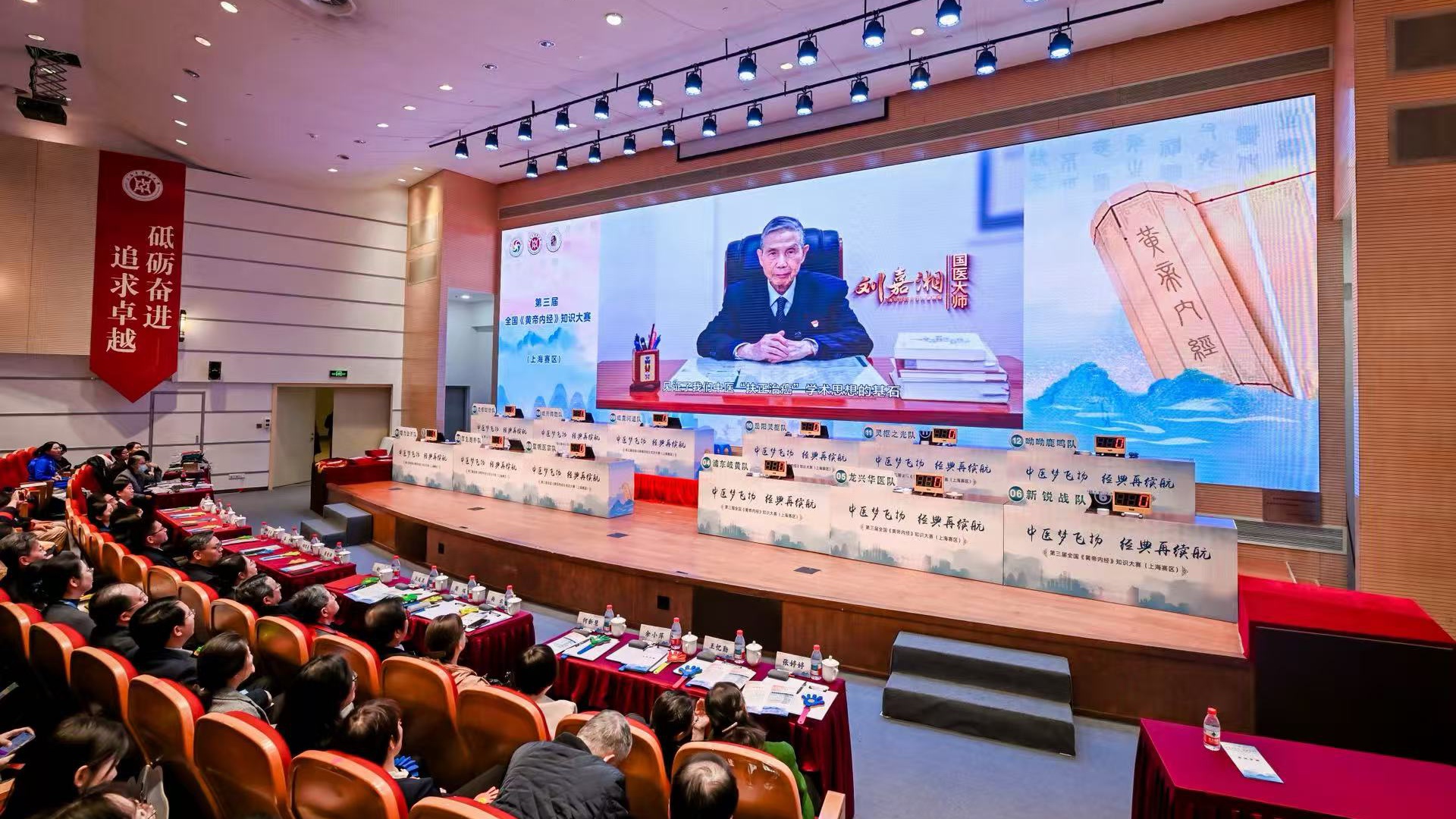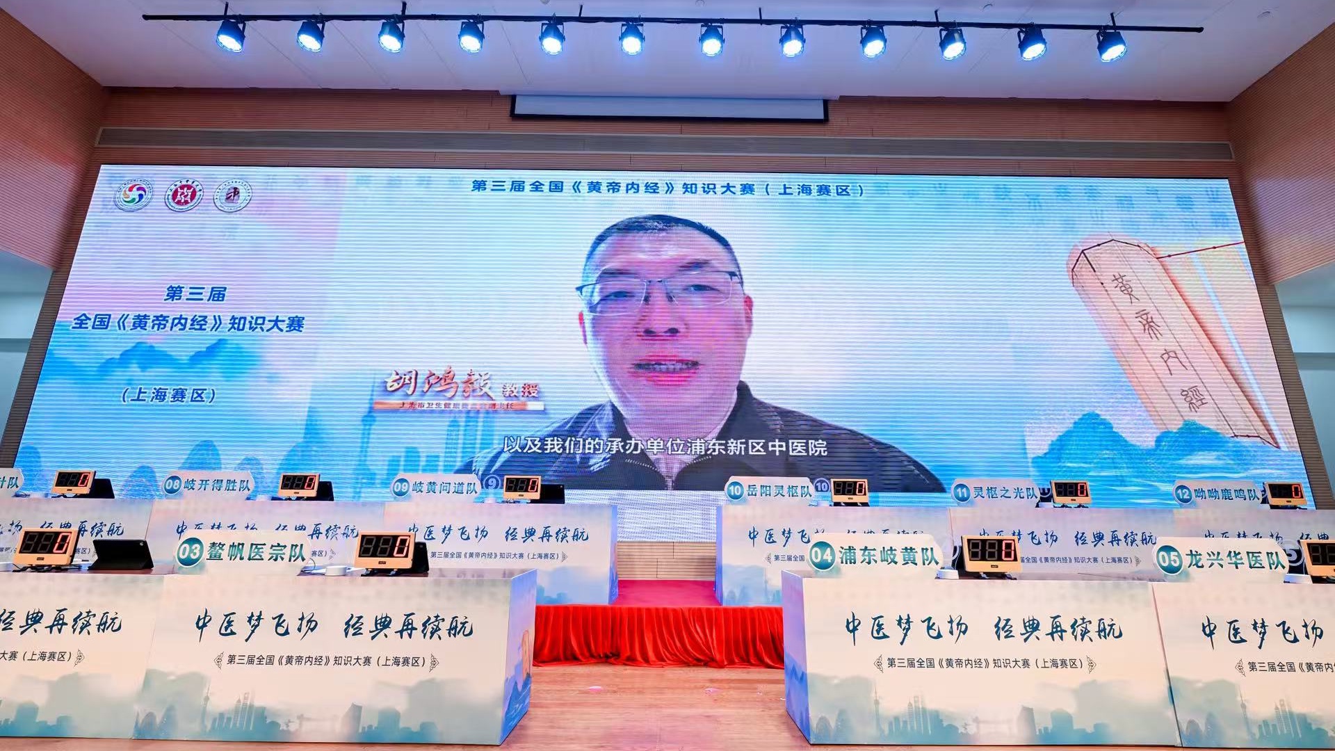 上海中医药大学副校长舒静致欢迎辞。国医大师刘嘉湘、施杞、严世芸,上海市卫生健康委员会副主任胡鸿毅视频讲话,寄语参赛选手赛出水平、赛出风采,勉励广大师生将《黄帝内经》的智慧转化为服务人民健康的中医药特色优势。