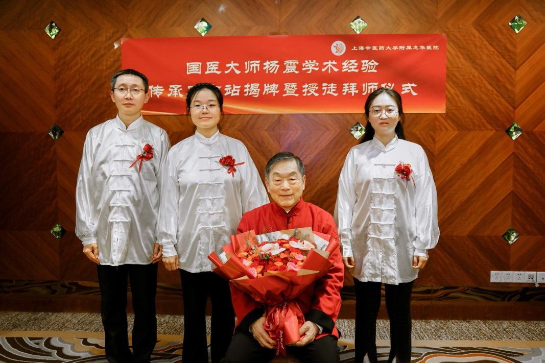 近日,杨震国医大师传承工作站在上海中医药大学附属龙华医院签约、揭牌,并举行授徒拜师仪式。