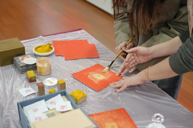 海派蜡笺抹金描金技艺,是上海地方特色的传统书画纸笺加工技艺,以繁复精妙的工艺令纸张呈现出莹润华贵之美。万佳欢老师执此技艺,于现场展示。红笺之上,金粉轻点慢描,顷刻间一枚金灿灿的元宝跃然而出,引来师生阵阵赞叹。