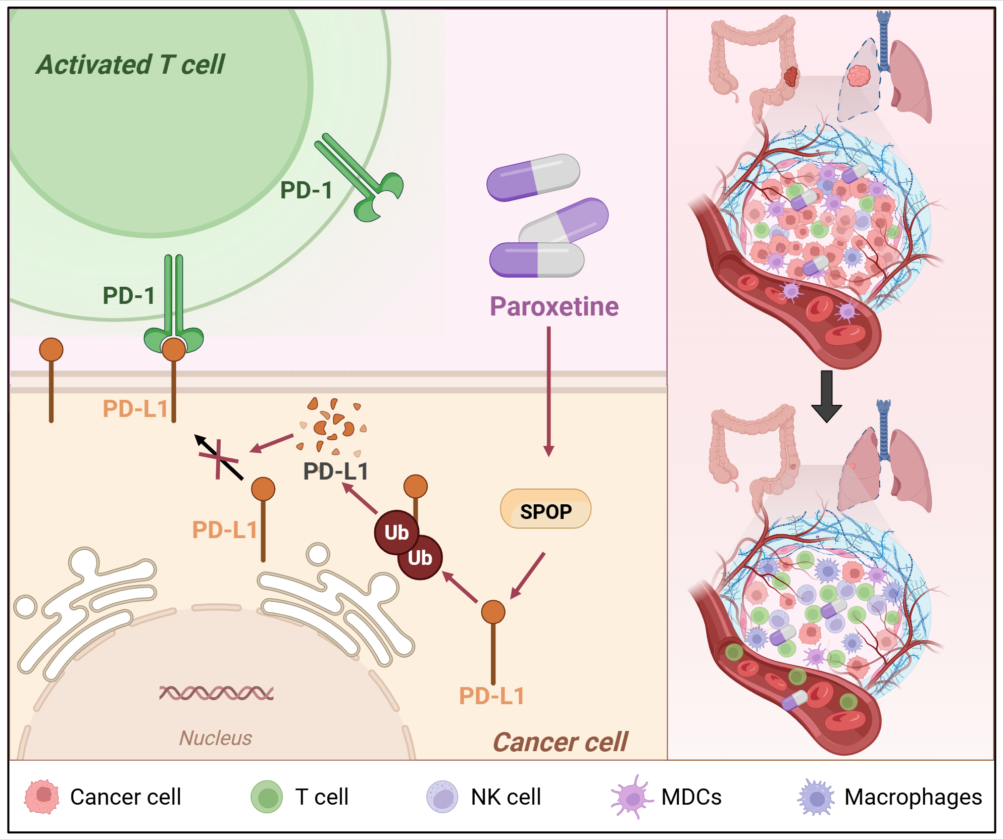 近年来,以PD-1/PD-L1抗体为代表的肿瘤免疫疗法虽取得革命性进展,但仍面临诸多瓶颈:治疗费用高昂,让不少患者望而却步;患者应答率有限,部分患者难以从中获益;同时,耐药性问题也制约着治疗效果的持续发挥。而开发全新小分子抑制剂,往往存在过程复杂、研发周期漫长等问题。为此,研究团队另辟蹊径,聚焦“老药新用”这一创新策略。经过深入研究,团队发现已在临床上广泛应用的抗抑郁药物帕罗西汀,具备高效诱导肿瘤细胞内PD-L1蛋白降解的独特能力。机制研究进一步揭示了其作用路径:帕罗西汀通过特异性作用于E3泛素连接酶SPOP,稳定其功能,进而促使PD-L1发生泛素化修饰,并通过蛋白酶体途径被降解,从源头上解除PD-L1对免疫细胞的抑制,让免疫细胞重新恢复对肿瘤细胞的杀伤能力。在动物实验中,帕罗西汀展现出优异的抗肿瘤效果:与现有CTLA-4抗体联用可产生协同抗肿瘤作用,显著提升治疗效果;同时,它还能有效重塑肿瘤免疫微环境,促进杀伤性T细胞向肿瘤组织浸润,并减少免疫抑制性细胞的数量。值得关注的是,在AOM/DSS诱导的结肠癌模型中,帕罗西汀同样表现出显著的抗肿瘤活性,验证了其治疗潜力。
