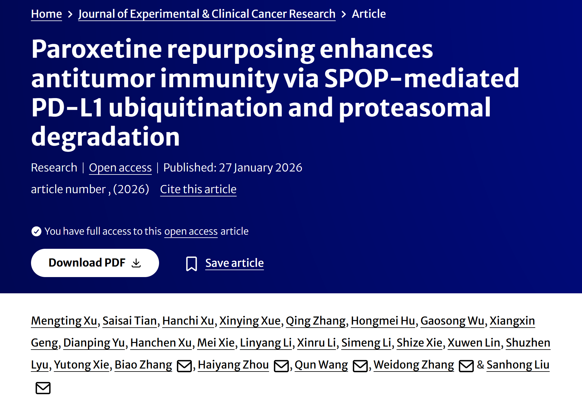 近日,我校交叉科学研究院刘三宏团队联合海军军医大学张卫东团队及长征医院周海洋团队,在国际知名学术期刊《Journal of Experimental & Clinical Cancer Research》发表研究成果。论文以“Paroxetine repurposing enhances antitumor immunity via SPOP-mediated PD-L1 ubiquitination and proteasomal degradation”为题,系统阐明常用抗抑郁药物帕罗西汀可通过降解免疫抑制蛋白PD-L1激活肿瘤免疫,成功实现“老药新用”。这一发现为肿瘤免疫治疗提供了已上市、低成本、可口服的新型治疗选择,临床转化前景十分广阔。