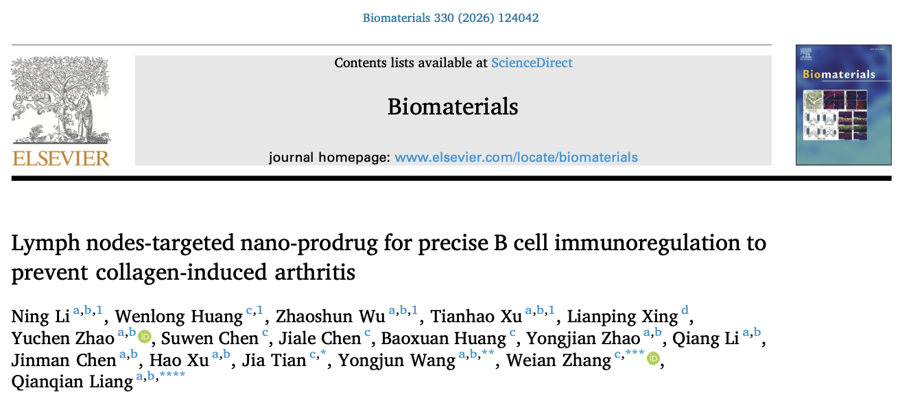 2月12日,上海中医药大学附属龙华医院梁倩倩教授、王拥军教授团队,联合华东理工大学张伟安教授、田佳副研究员团队,在国际知名期刊《Biomaterials》在线发表了题为《Lymph nodes-targeted nano-prodrug for precise B cell immunoregulation to prevent collagen-induced arthritis》的研究论文。该研究创新性地构建了一种靶向淋巴结的光控释放纳米前药(HC-IBR),在类风湿关节炎(RA)动物模型中证实了其预防效果及机制,为中医“治未病”思想转化为精准预防策略提供了重要的实验依据。